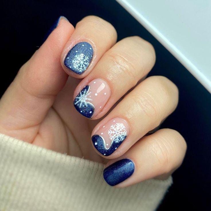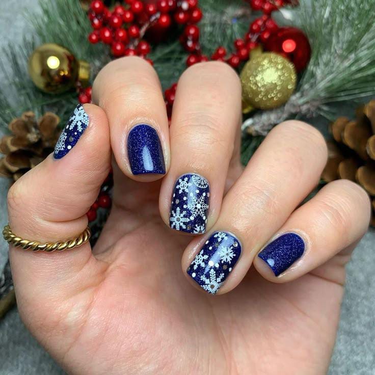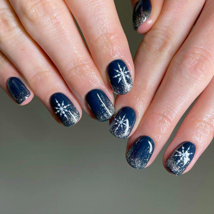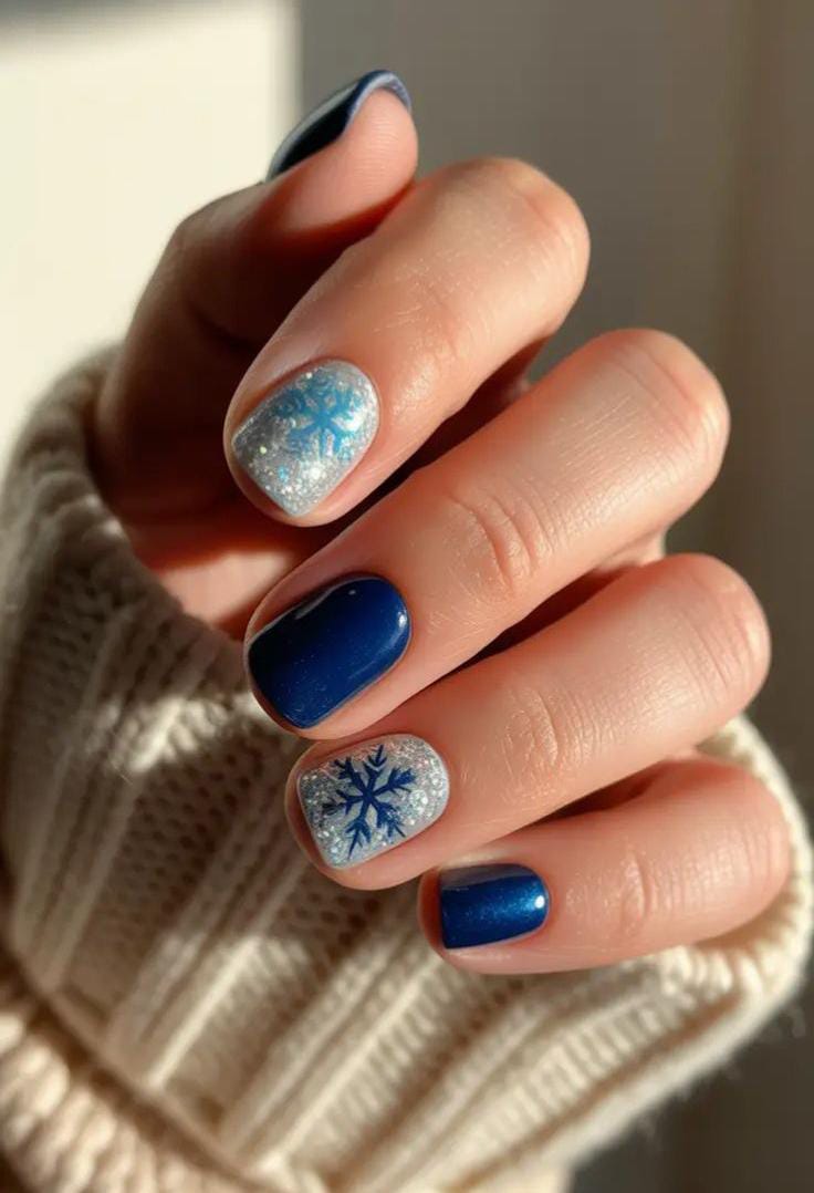 Deep navy blue nails contrast beautifully with silver-glitter bases and blue snowflake designs, giving the whole look a bold, crisp, winter-night feel.