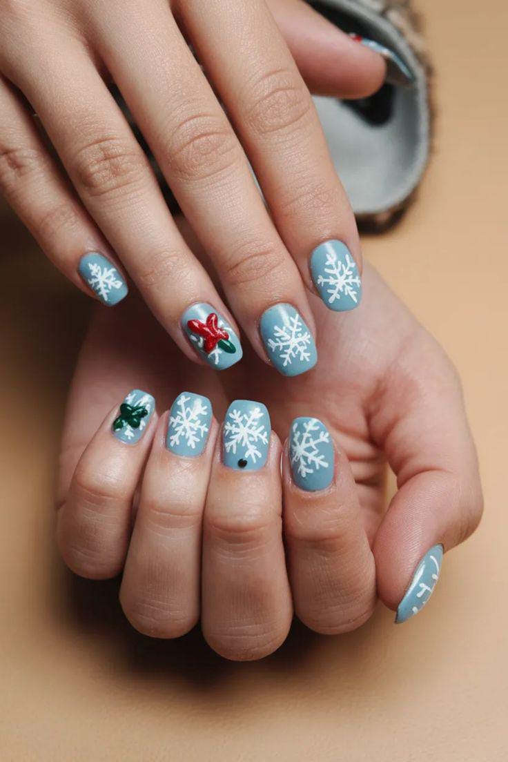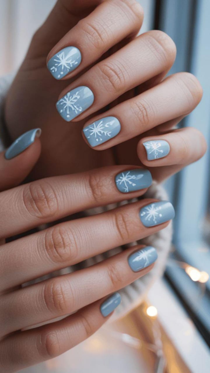 Light-blue nails are paired with delicate white snowflake art, creating a calm and cozy winter aesthetic. The design feels minimal yet seasonal, perfect for those who love a softer winter palette.