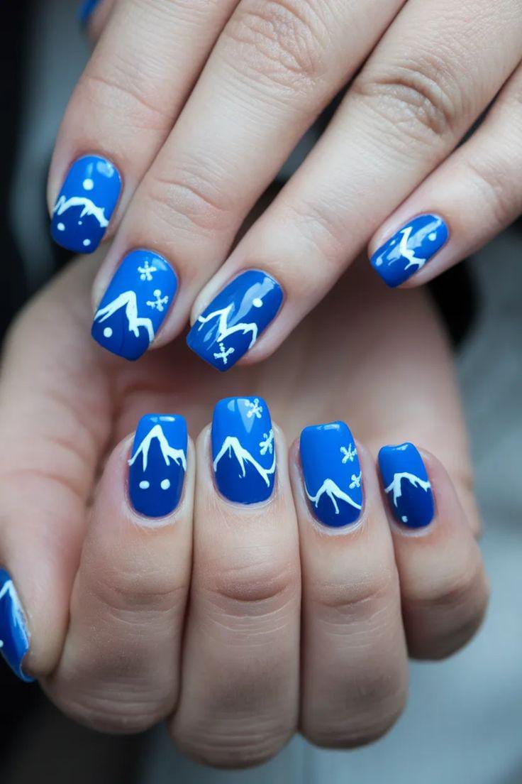 Bright blue nails are decorated with simple white mountain outlines and tiny snowflakes, creating a playful snowy-mountain scene that feels bold yet wintry.