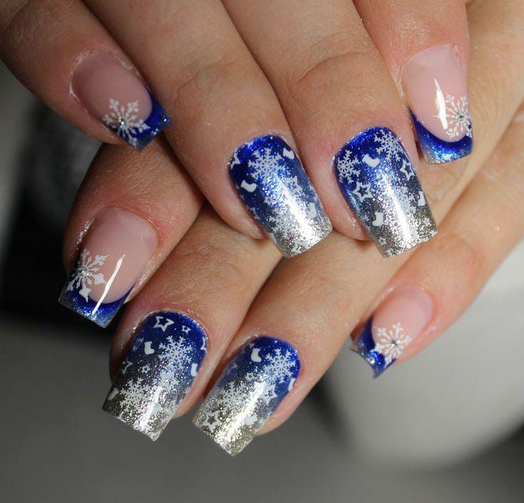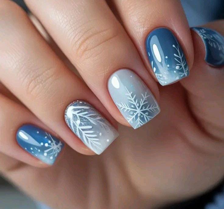 These square nails mix deep blue, silver glitter, and delicate snowflakes in a gradient effect, creating a glamorous frosty look that sparkles like icy winter lights.