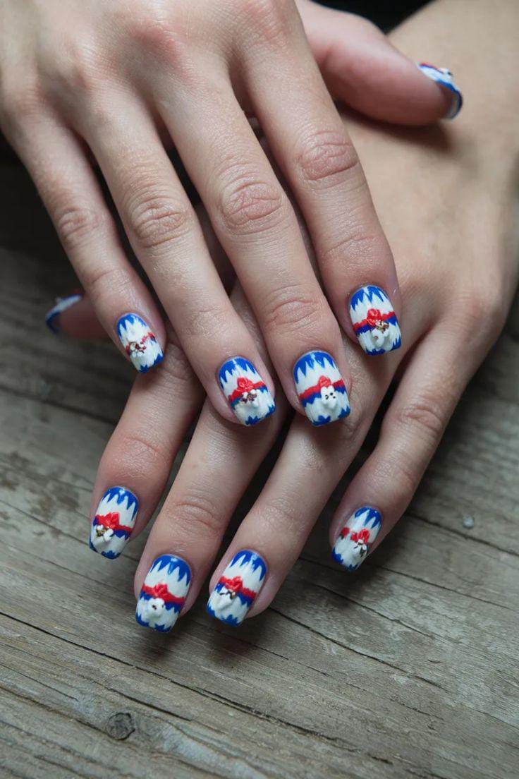 A fun and cozy design with blue and white icicle-like borders framing adorable little bear faces wearing red bows, giving the nails a cheerful winter holiday feel.