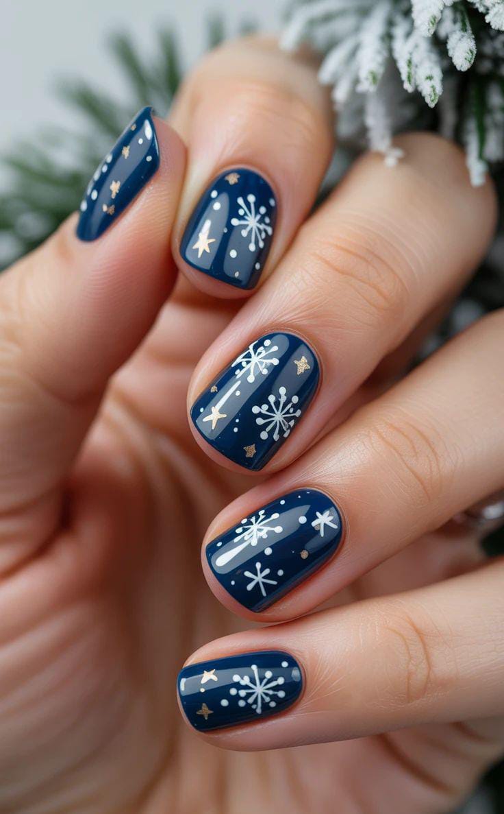 This design features deep navy-blue nails decorated with soft white snowflakes and tiny dotted accents, giving a cozy winter-night feel. The subtle gold stars add a touch of festive sparkle.
