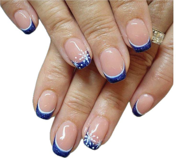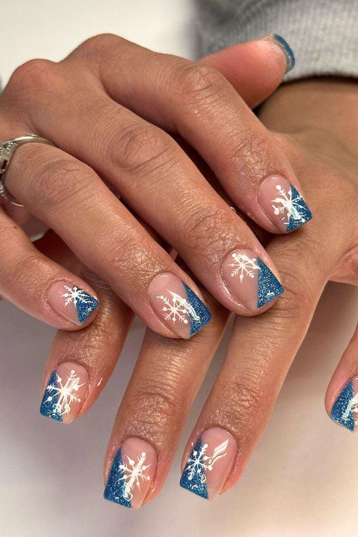 A nude base paired with shimmering blue French tips and tiny snowflake details gives this look a clean, festive, and subtly elegant winter feel.