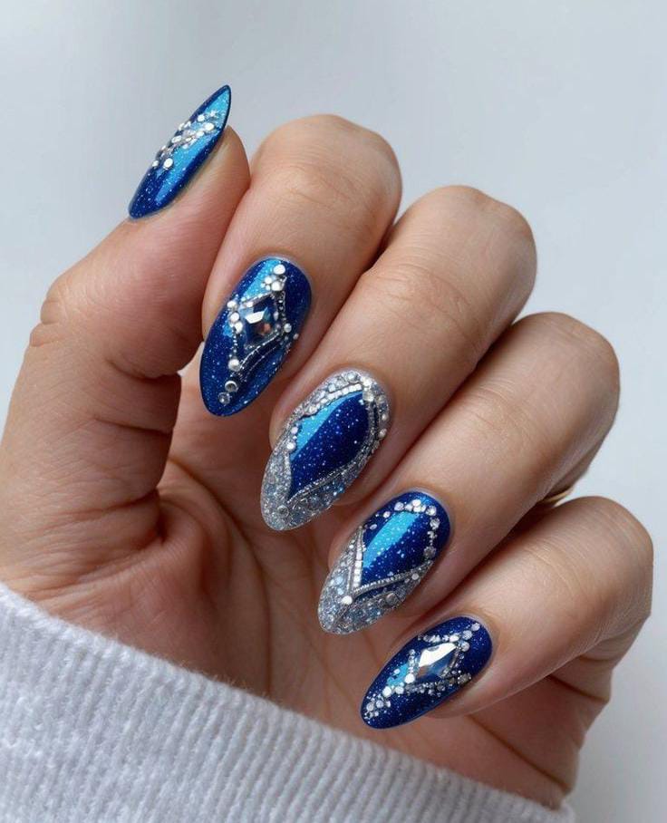 Bold royal-blue nails are enhanced with metallic silver accents and crystal-like embellishments, creating a glamorous, icy-luxury style. The combination feels wintry, dramatic, and jewel-inspired.