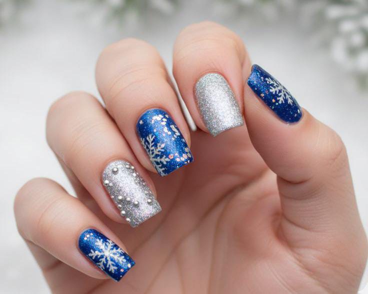 A mix of glittery silver and deep blue nails with snowflake art gives this design a festive, frosty charm. The added silver studs add dimension while keeping everything sleek and seasonal.