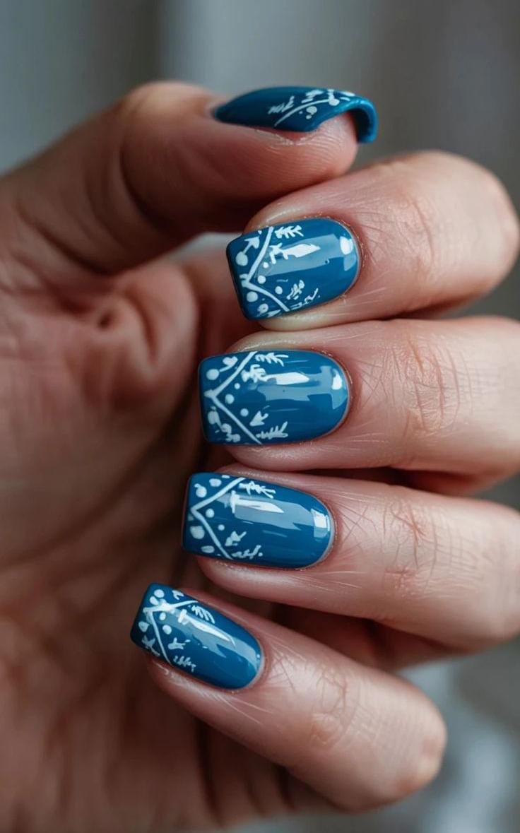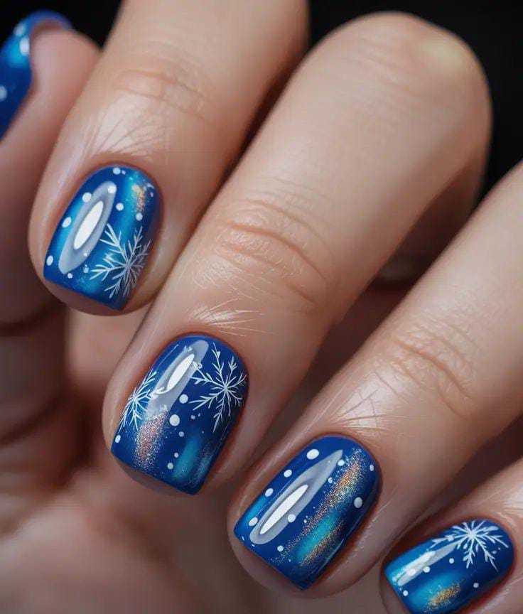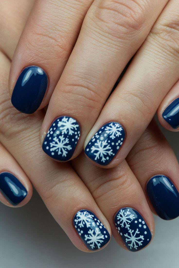 Deep sapphire nails are paired with crisp white snowflakes and subtle shimmer, creating a bold, nighttime–winter look full of contrast and sparkle.