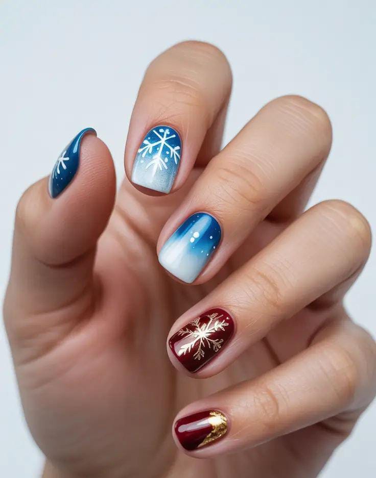 This set blends blue ombré nails with soft snowflakes and rich red accents with golden designs, giving a chic mix-and-match winter feel. The combination creates a playful yet classy holiday vibe.