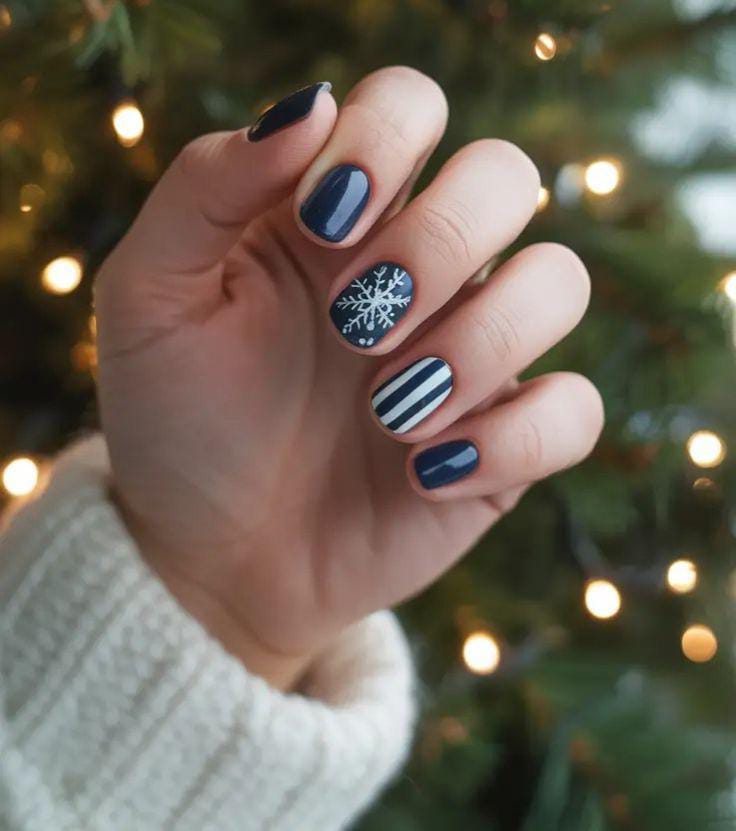 A deep navy base is paired with a crisp white snowflake and clean vertical stripes, giving the nails a cozy, winter-classic look. The design feels polished yet playful, perfect for cold-season minimalism.