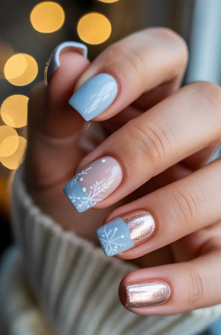 Soft icy blue tips and delicate snowflake art blend with a touch of rose-gold shimmer for a wintry, feminine finish. It’s a calm, frosty palette with a hint of holiday glam.