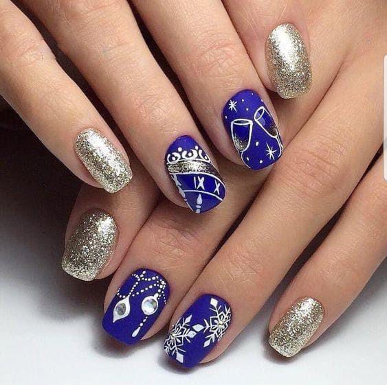 Bold royal blue nails are accented with gold glitter and festive white designs like snowflakes, ornaments, and champagne glasses. It’s a dramatic, party-ready winter look with luxe energy.