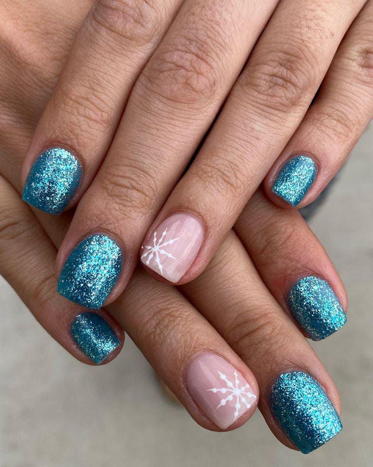 Bright turquoise glitter nails are balanced with a couple of soft nude accent nails featuring simple white snowflakes, giving a fun and frosty look perfect for winter.