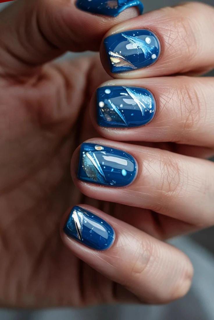 Rich blue nails with metallic accents, scattered dots, and shimmering strokes create a celestial, icy-sky feel. The design has a modern, winter-galaxy vibe that’s both stylish and bold.