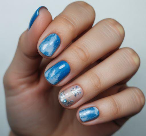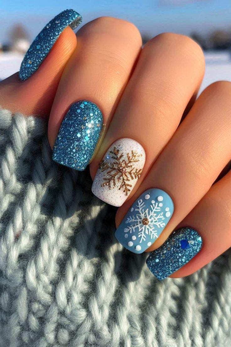 This design blends bold blue glitter nails with soft, wintry accent nails featuring white and gold snowflakes, giving the whole look a magical, frosted-morning vibe.