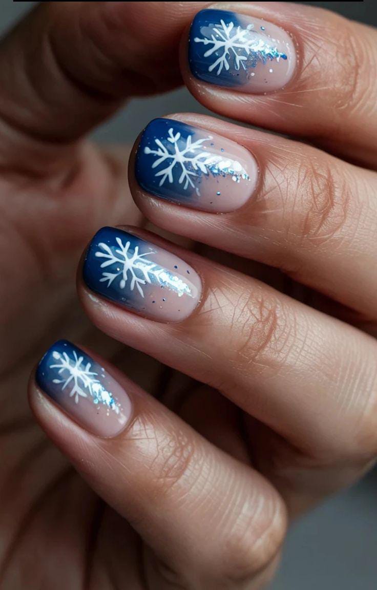 A smooth ombré blend of light blue to deep navy sets the backdrop for crisp white snowflakes, giving the nails a cool, dreamy winter-night vibe.