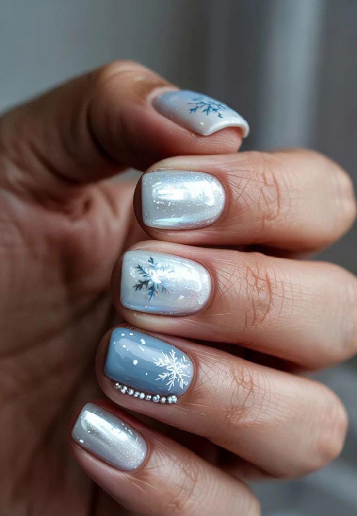 Shimmery pearl-white and pale blue nails are accented with dainty snowflake art and a touch of sparkle, creating a clean, frosty, and elegant winter feel.