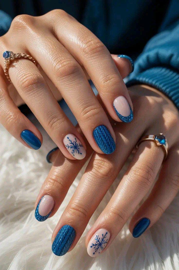 Rich blue nails mix textured knit patterns, minimal nude accents, and simple snowflake designs for a cozy, sweater-inspired winter look.