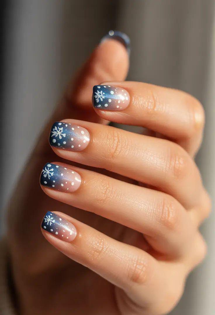 This look blends a soft nude base into a deep midnight blue, finished with delicate white snowflakes and scattered dots that mimic falling snow, giving the nails a dreamy winter-night atmosphere.