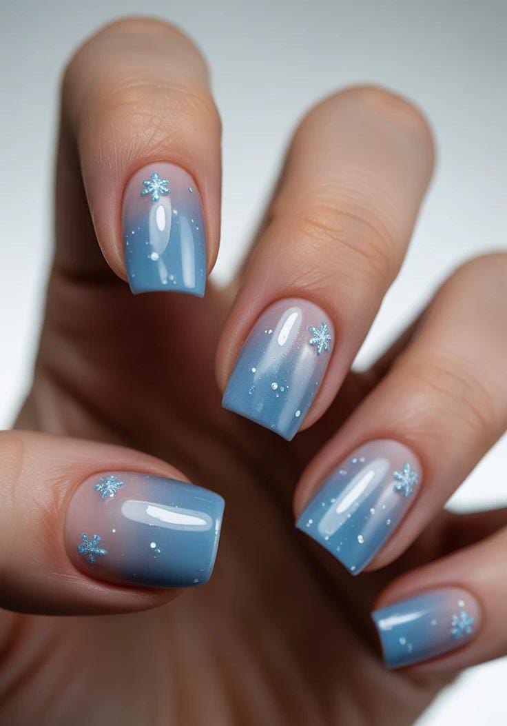 A smooth gradient from nude to icy blue is topped with delicate white snowflakes and light glitter, giving the nails a soft, snowy fade winter effect.