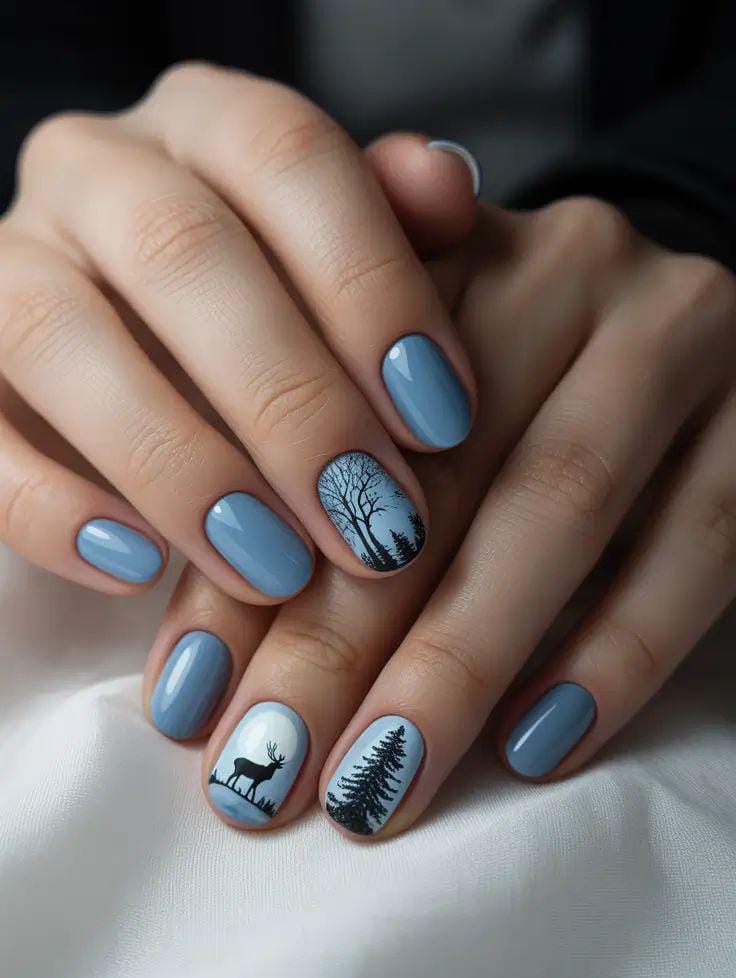 Soft blue nails pair with striking accent nails featuring black silhouettes of trees and a deer, coming together to create a peaceful winter-forest scene that feels calm, artistic, and seasonally cozy.