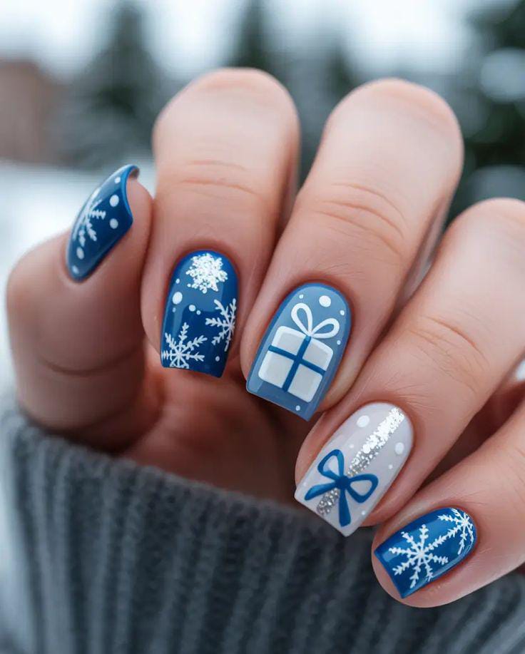 Bold blue and white nails are decorated with crisp snowflakes, wrapped-present designs, and ribbon details, giving the whole set a fun, festive holiday vibe perfect for winter celebrations.