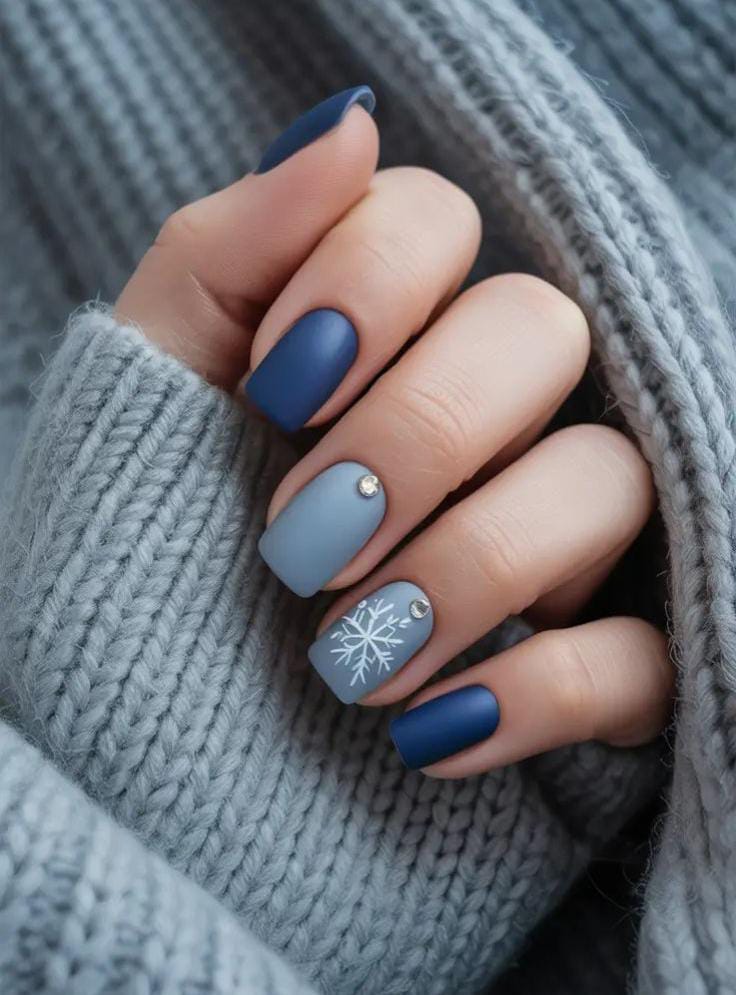 Matte navy and grey nails with small rhinestones and a crisp white snowflake create a chic, soft-touch winter style that feels both modern and cozy.