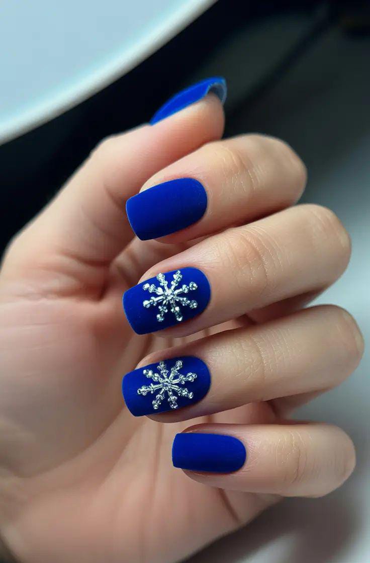 Rich matte royal-blue nails are highlighted with gleaming silver snowflake accents, creating a bold yet elegant winter look that mixes icy shimmer with a smooth, velvety finish.