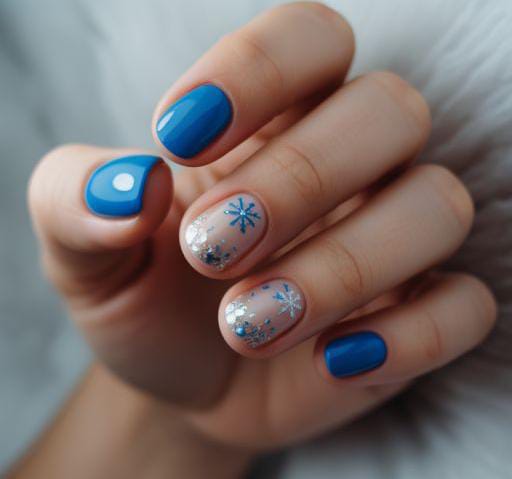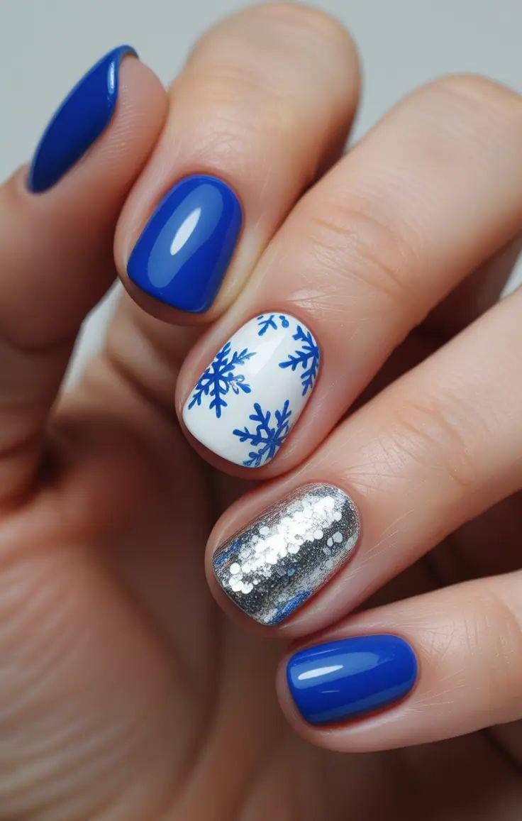 A mix of glossy royal-blue nails, a crisp white snowflake accent, and a shimmering silver nail creates a polished, modern winter look.