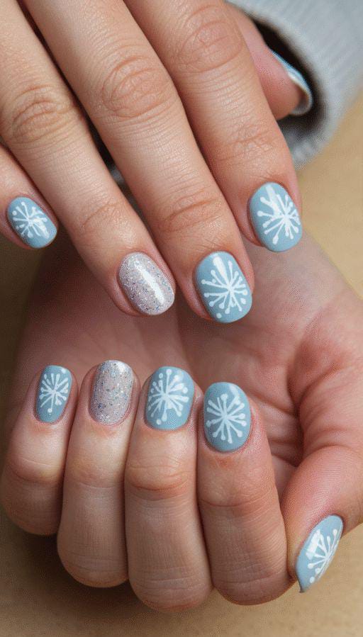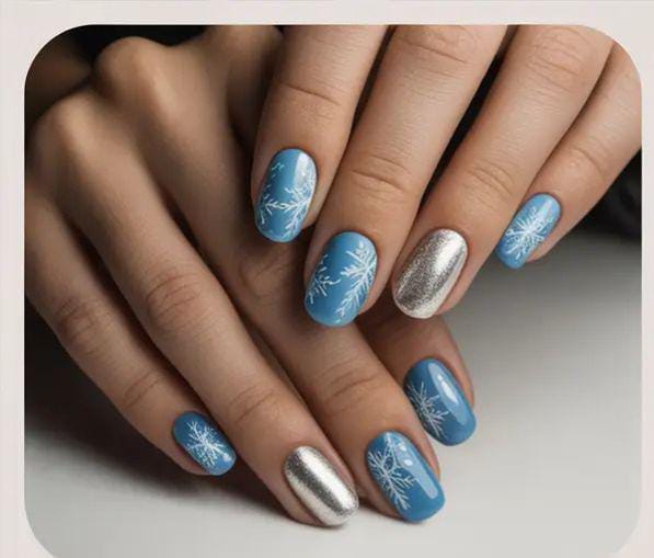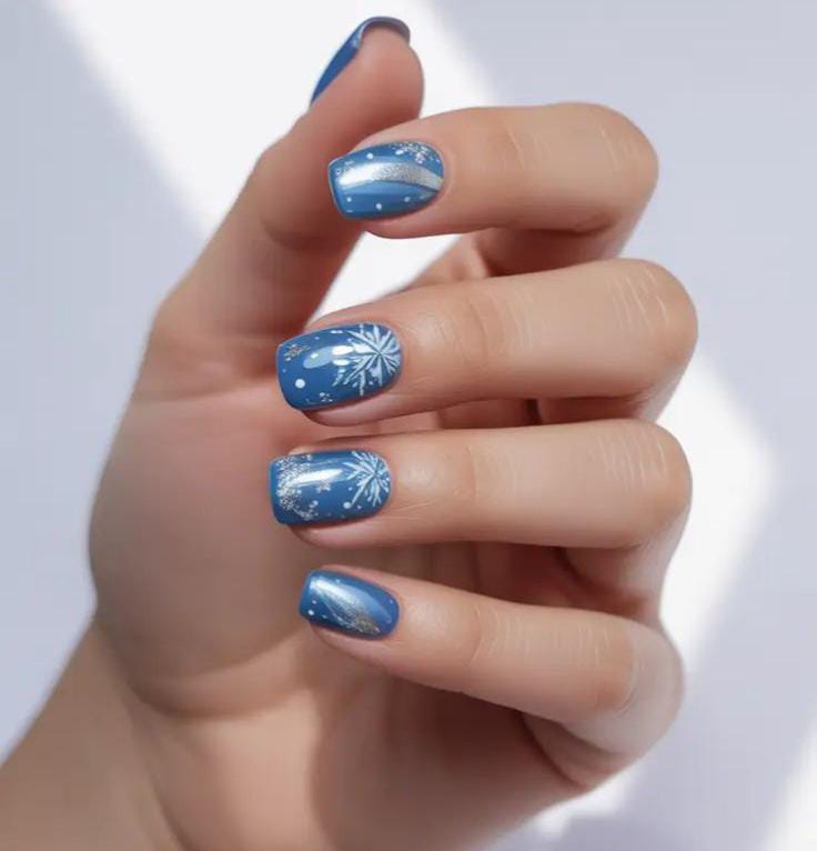Muted-blue nails are matched with simple white snowflakes and a touch of silver glitter, giving a subtle winter glow. The look is soft, tidy, and effortlessly seasonal, great for everyday wear in colder months.