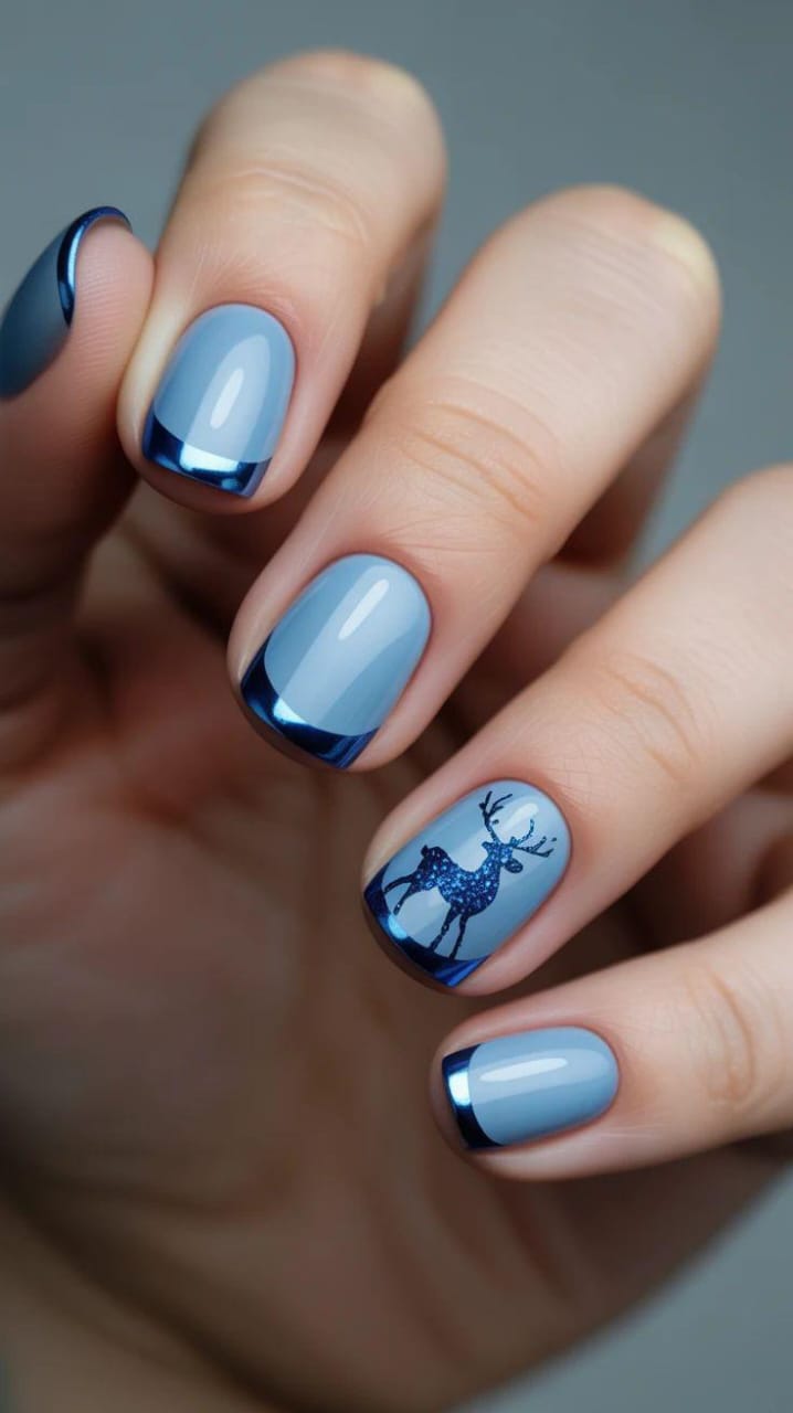 Soft icy-blue nails are outlined with a shiny dark-blue French tip, while one nail showcases a glittery reindeer silhouette for a subtle festive touch. The look is clean, wintry, and stylish without being overly bold.