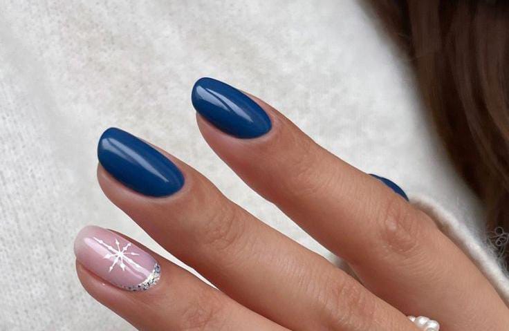 Rich blue nails are paired with a single pale pink accent nail decorated with a sparkling snowflake and silver curve, adding a sleek and feminine winter touch.