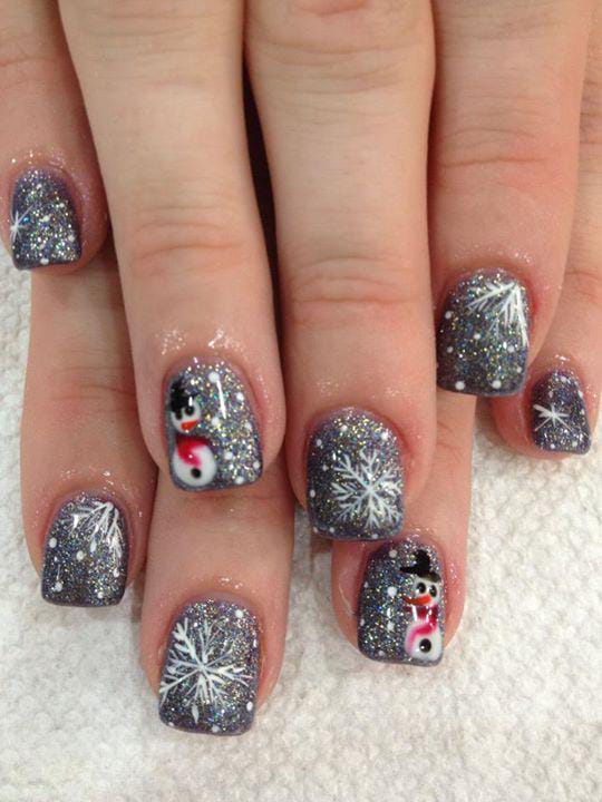 This design pairs short, glittery silver nails with bold white snowflakes and a small painted snowman, creating a fun winter December look that feels both festive and sparkly without being overwhelming.