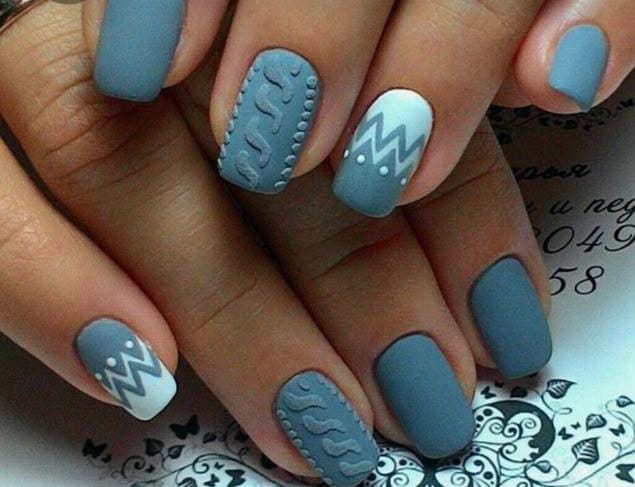 Matte blue nails are combined with subtle light blue patterns and raised sweater-style patterns, giving the whole set a soft, cozy, knitted-sweater vibe for cold December days.
