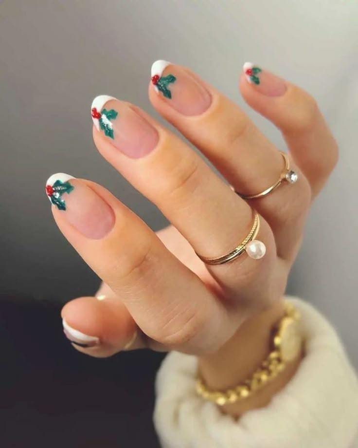 A soft nude base with crisp white tips, accented by tiny holly leaves and red berries for a subtle, festive touch. The look feels clean, minimal, and perfectly seasonal December.