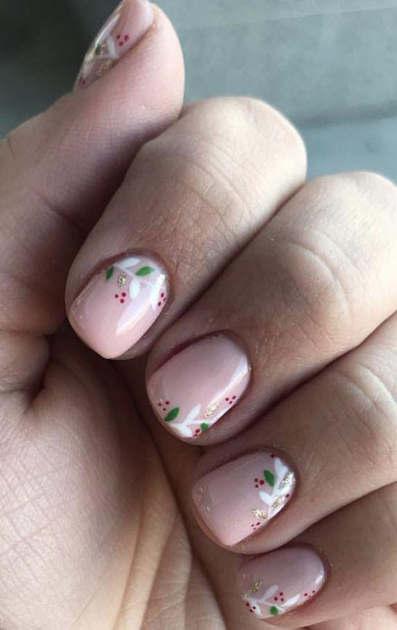 Light pink nails decorated with small white floral accents, green leaves, and tiny red dots that add a gentle winter-garden December vibe. The design is sweet, soft, and very wearable.