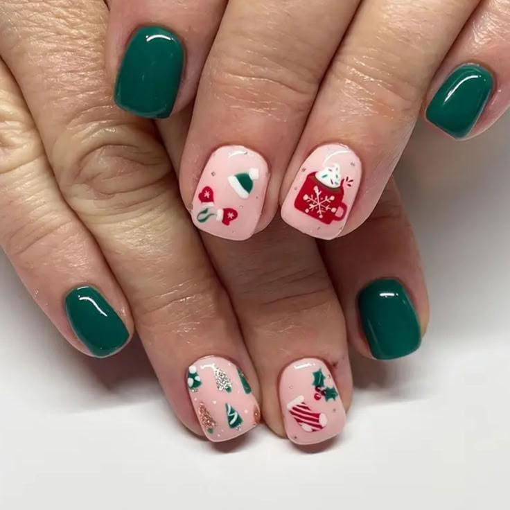 A mix of deep green nails and soft pink accents filled with tiny holiday icons like hats, candy canes, and ornaments. The overall vibe is cheerful, colorful, and full of Christmas and December spirit.