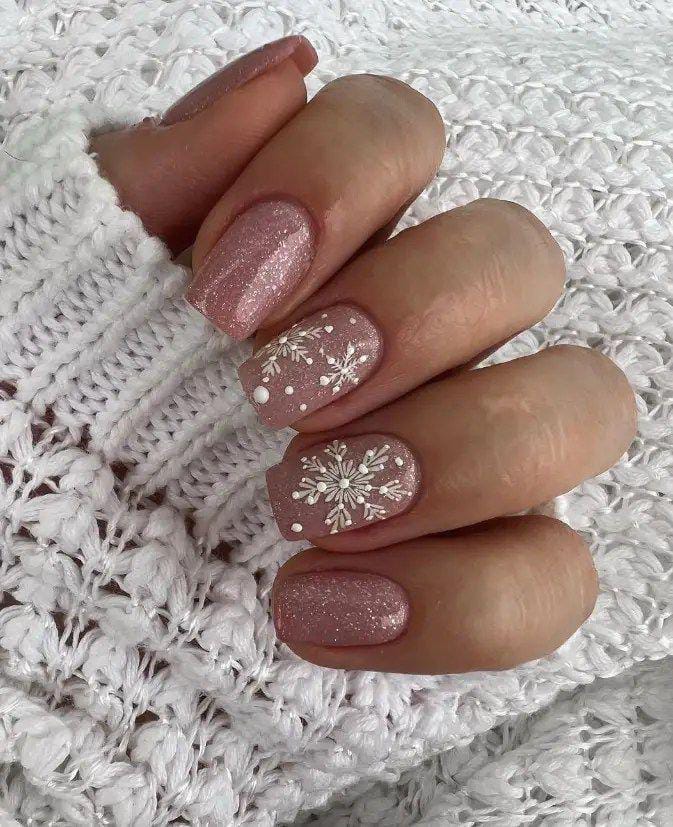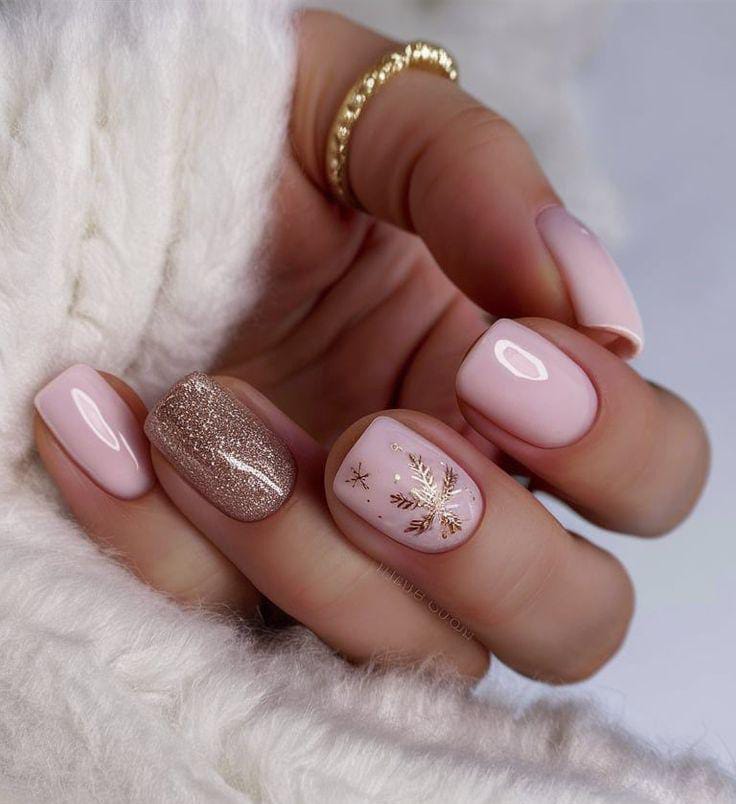 Soft blush-pink nails pair with a gold glitter accent and delicate golden snowflake detailing, offering a classy, feminine winter manicure with a subtle holiday and December glow.