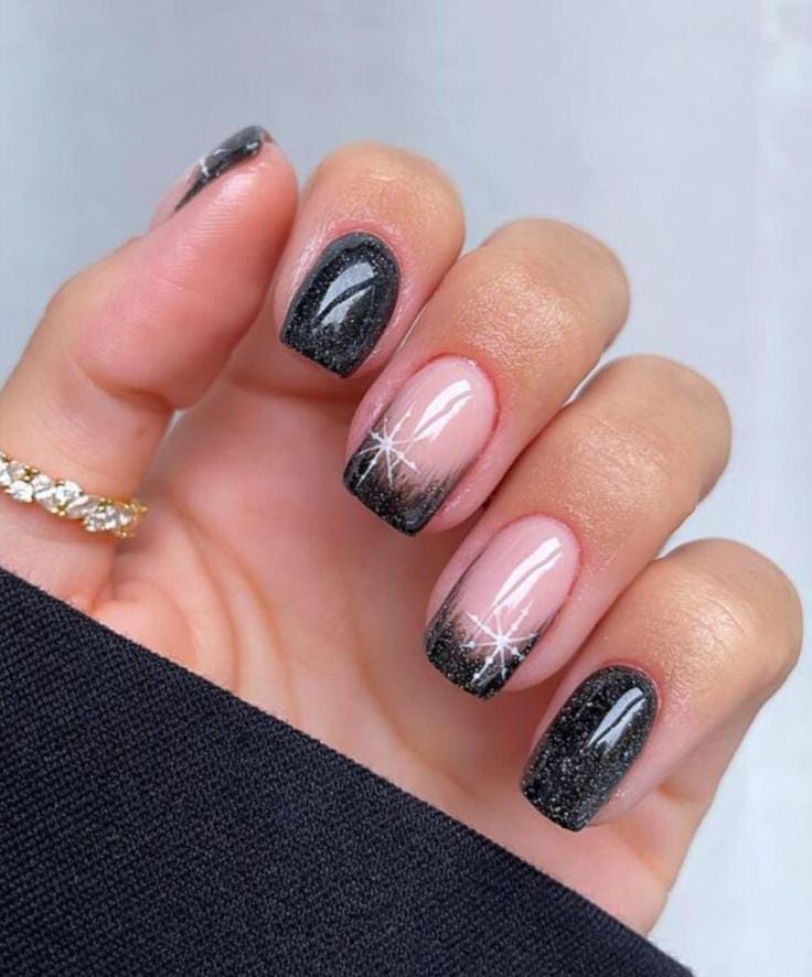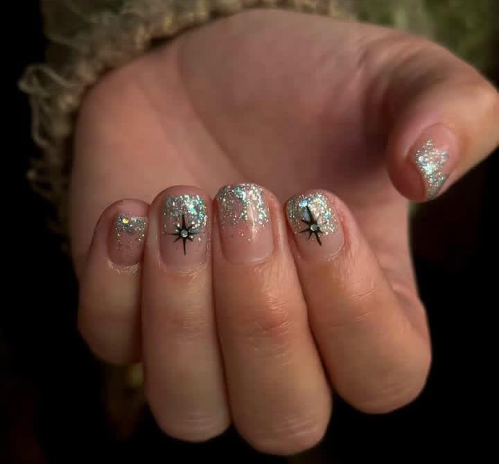 This design blends a soft nude base into a rich black glitter gradient, creating a smooth, December night-sky effect. The subtle star accents add a touch of elegance and make the nails feel festive without being overly busy.