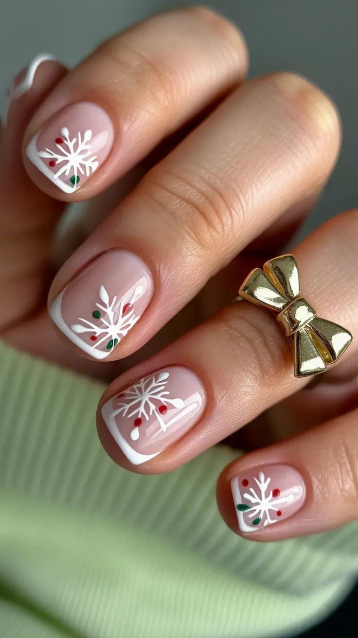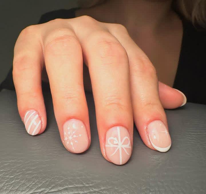 A soft nude base with simple white lines, tiny snowflakes, and ribbon-like accents creates a clean, understated December look. The design feels delicate and minimal while still seasonal.
