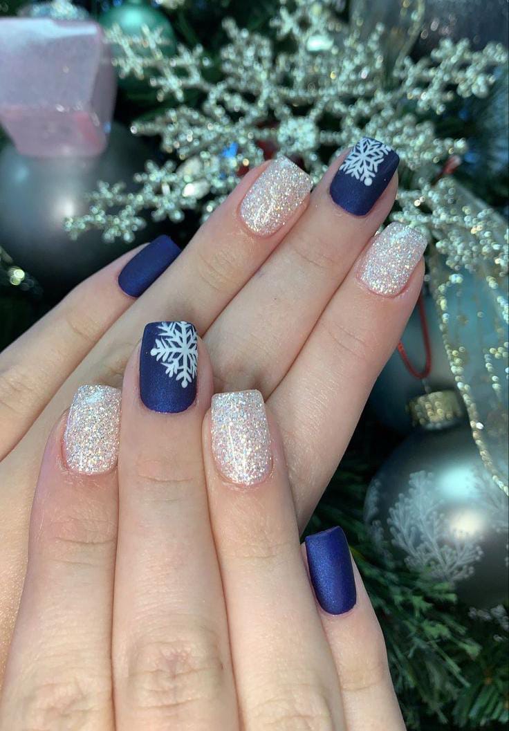 This set mixes deep matte navy nails with shimmering silver glitter and crisp white snowflakes, creating a cool, frosty December feel. The combination of textures makes the design look both bold and festive, perfect for winter celebrations.