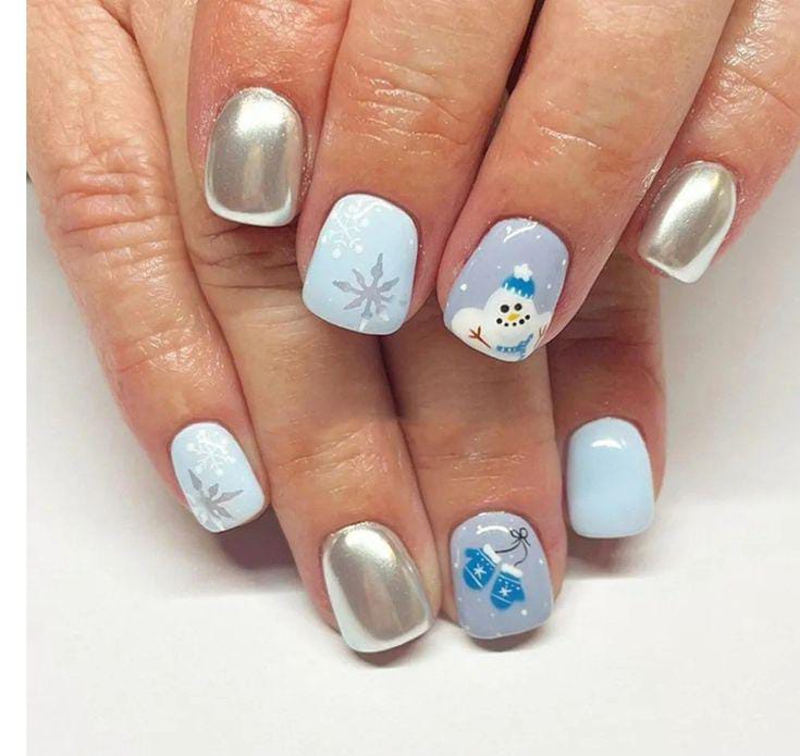 Soft pastel blues and metallic silvers blend across the nails, highlighted by delicate snowflakes and a cheerful snowman, giving the whole look a clean, frosty December feel that’s cute yet polished.