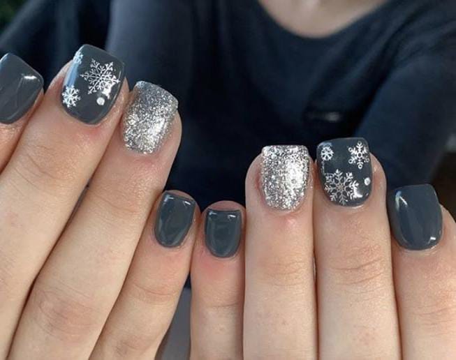 This design combines deep grey polish with silver glitter accents and delicate white snowflakes, creating a cozy yet festive winter look. The mix of shine and subtle art gives the short nails a polished December vibe.
