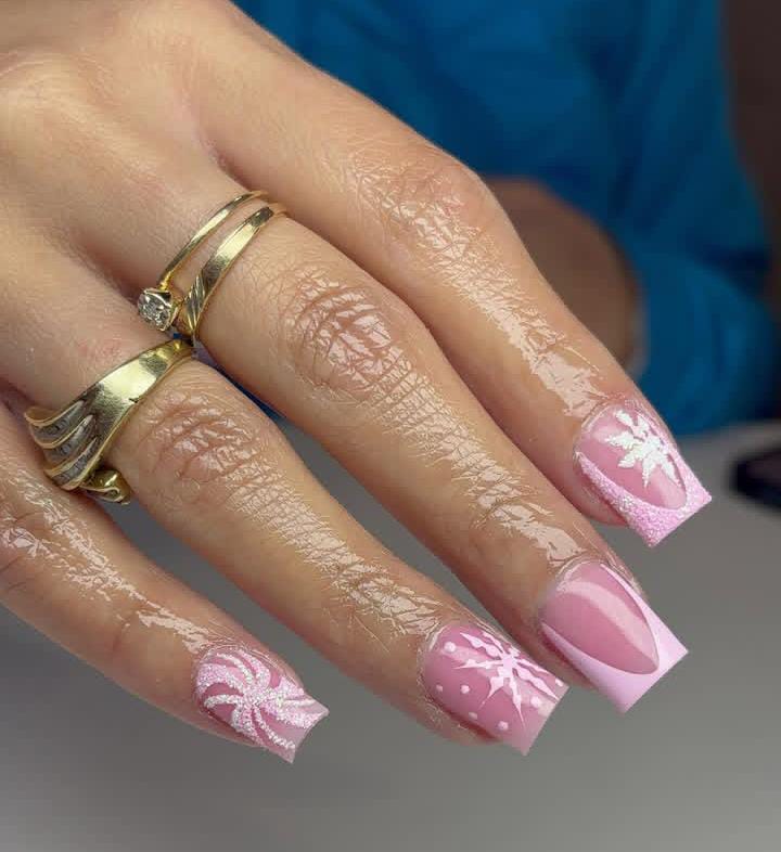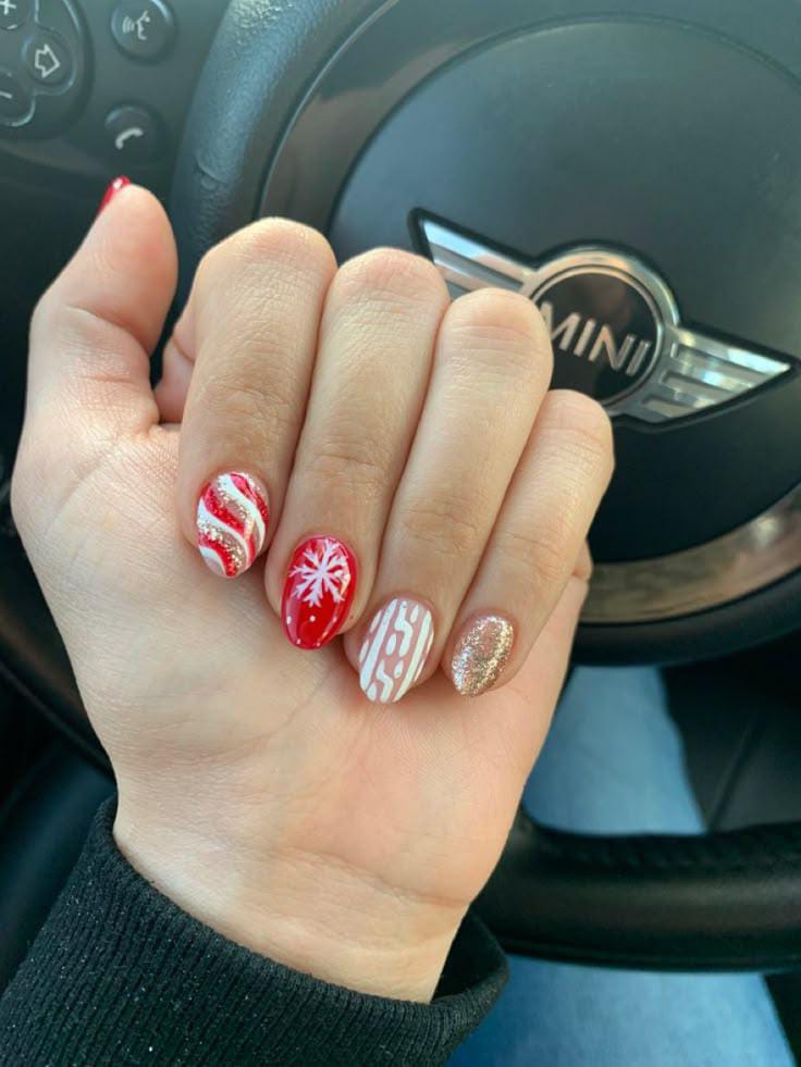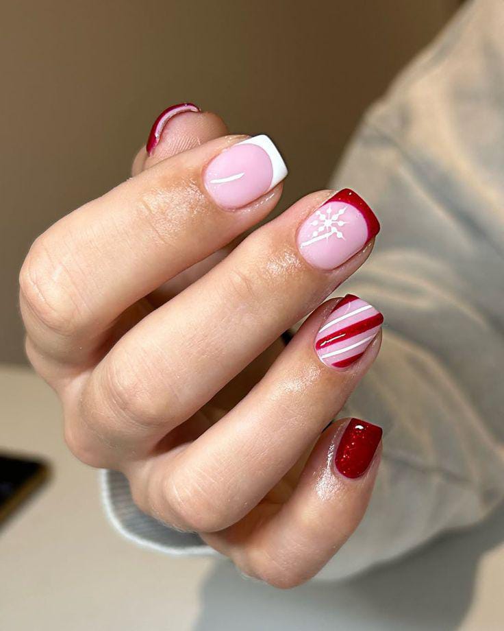 This design blends pink bases with red and white French tips, candy-cane stripes, glittery red polish, and a white snowflake accent. It’s a fun, playful mix of classic Christmas and December colors and patterns.