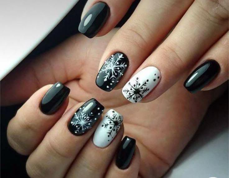 Glossy black and crisp white nails are paired with bold snowflake designs, creating a striking December and elegant contrast. The look feels modern and wintry with a touch of drama.