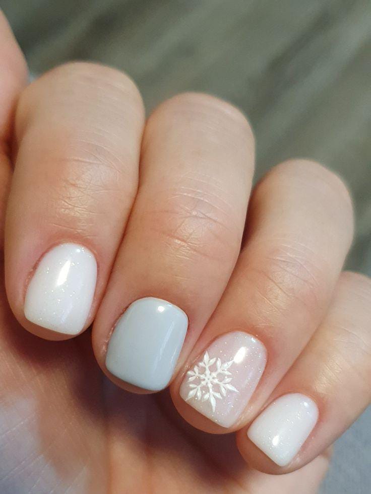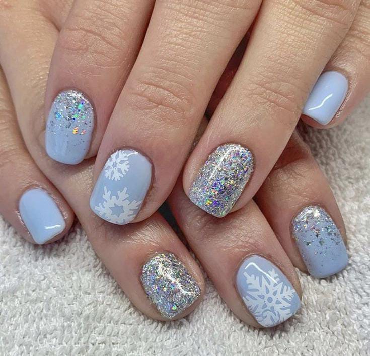 Pastel blue nails are paired with chunky silver glitter and white snowflake accents, giving the design a frosty, shimmering winter December feel. The mix of cool tones and sparkle makes the short nails look fresh and festive.
