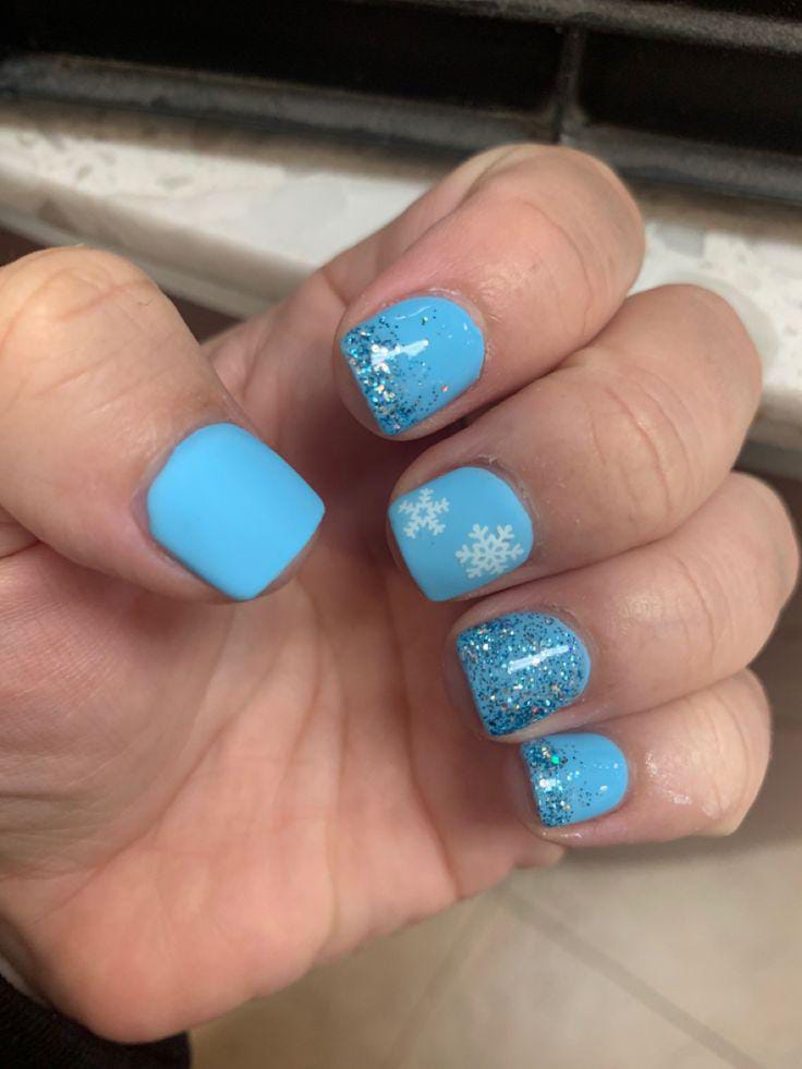This design features bright winter-blue nails paired with glittery tips and soft white snowflakes, creating a cheerful, seasonal look that feels playful yet festive for December.