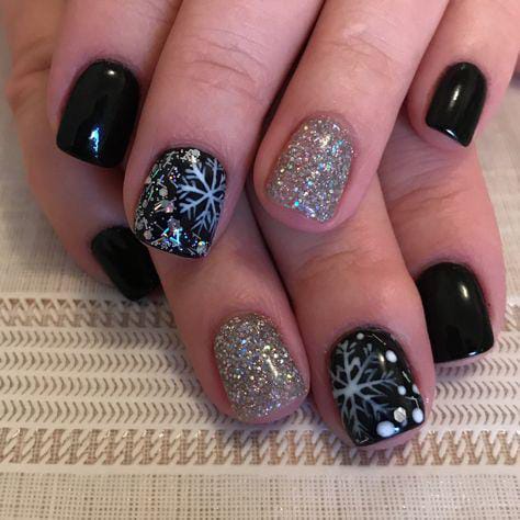 Rich black polish contrasts beautifully with silver glitter and white snowflake art, giving the nails a dramatic, night-sky effect that feels both elegant and winter-ready December.