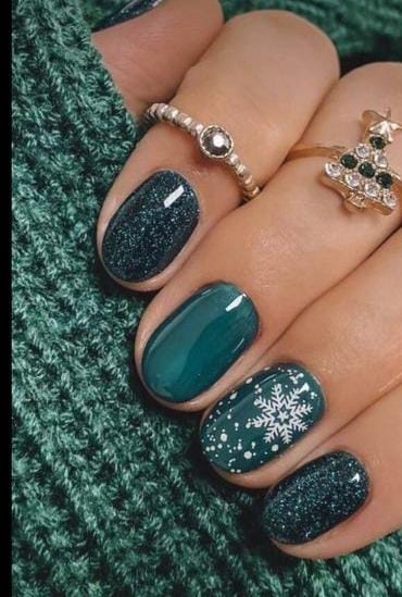Deep green tones blend with dark shimmer and a clean white snowflake to create a cozy, forest-inspired look that feels warm, seasonal, and perfect for December.