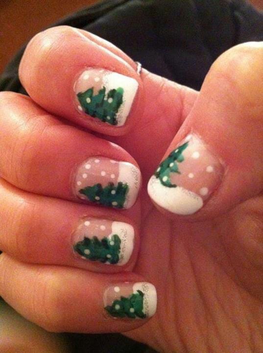 These short nude nails are topped with white snowy tips and little green pine trees, creating a cozy winter forest effect that feels simple, hand-painted, and perfect for a subtle December theme.