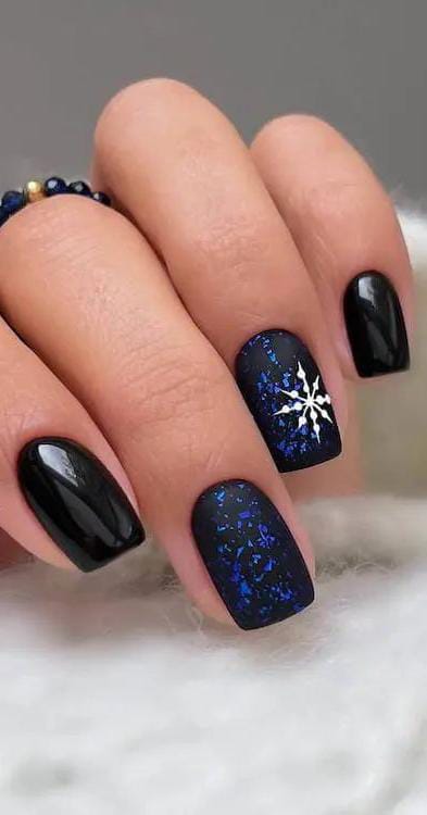 This look features short black nails accented with deep blue foil shimmer and a crisp white snowflake, giving a bold yet wintry December vibe. The mix of glossy and matte finishes adds subtle depth and elegance.