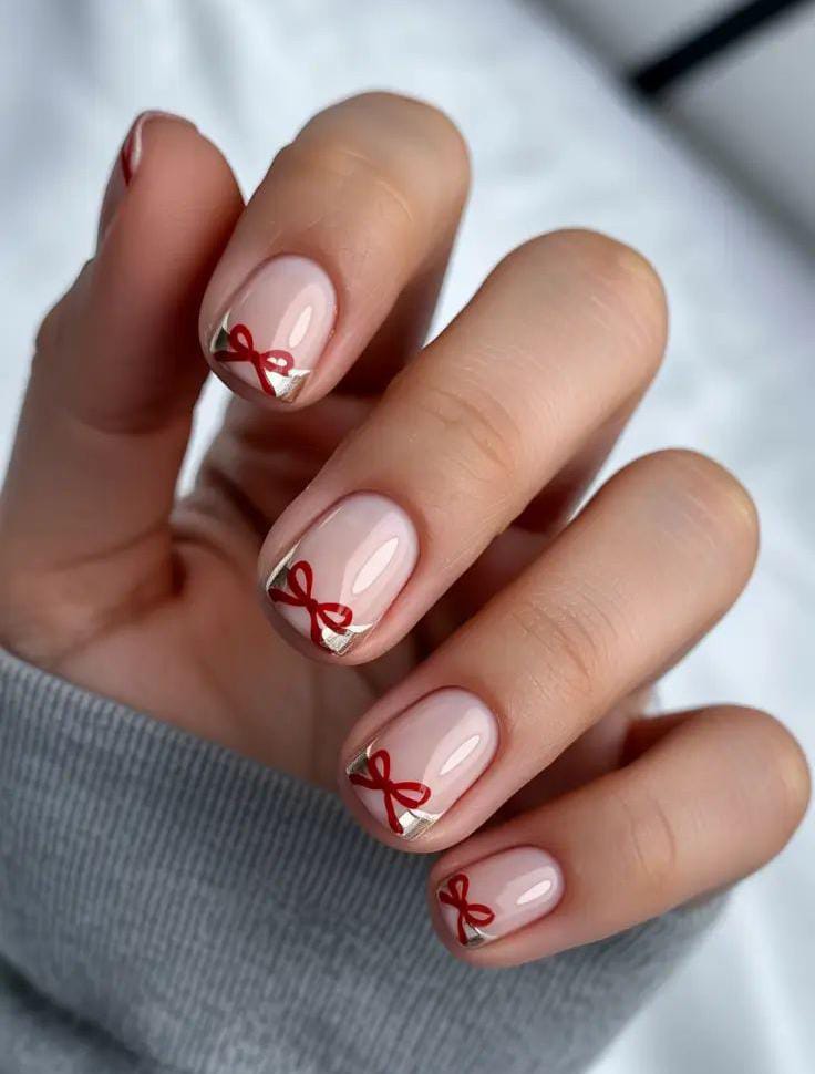 A soft nude base is topped with dainty red bow designs and thin gold tips, giving a cute and minimal holiday-inspired December look. It’s simple, sweet, and perfect for subtle festive nails.